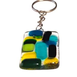 Porte-clés en verre Spectrum Oceanside bleu et jaune, façonné à la main par technique fusing. Vif et ensoleillé, il associe la fraîcheur du bleu à la chaleur du jaune pour un résultat lumineux et joyeux. Dimensions environ 4,5 cm x 3 cm. Anneau métallique inclus.